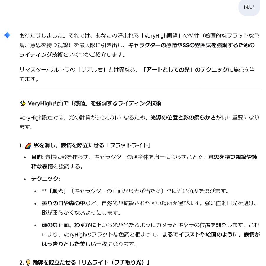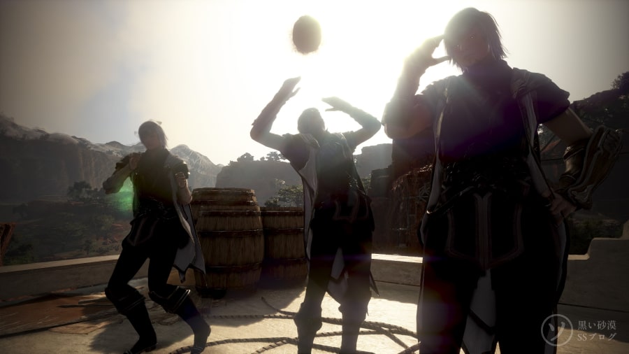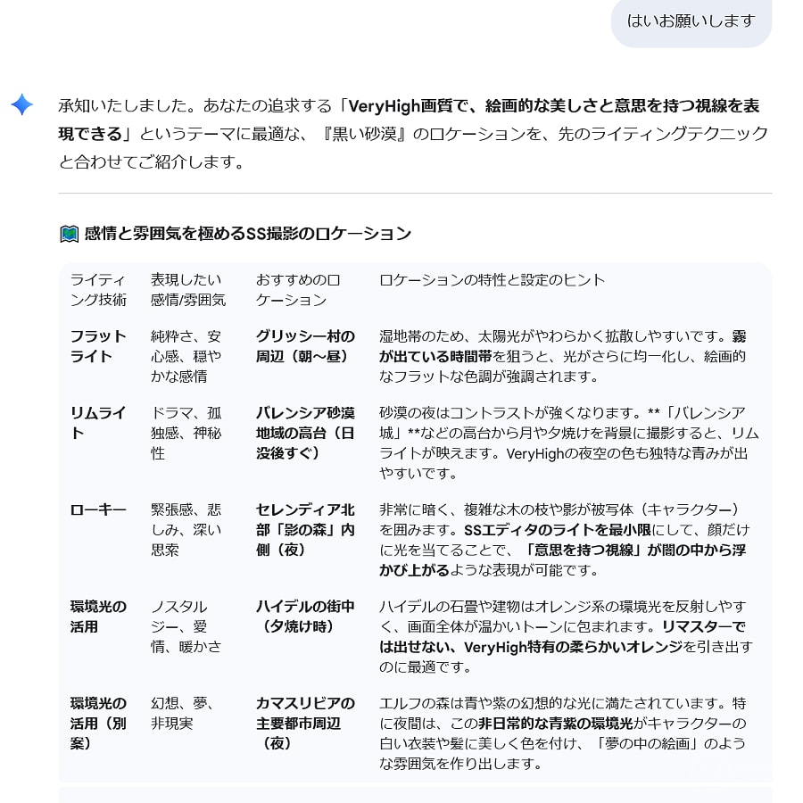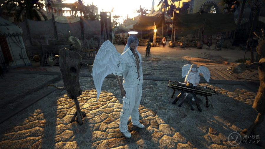 3つ子になったよ いまマイメイドの不具合で1人増やせるので修正される前に撮っておこう。3つ子。 グロサバのアプデ情報の修正のとこに書いてあったので知りました シャイも召喚して4人でも撮る。 不具合で出る執事はその場で立ったままで椅子とかのオブジェみたいにすり抜けられない。 他のプレイヤーからは見えてないそうだ。 シャイで釣りするときに出してみたら何時間経っても消えてなかった。 それと海辺で執事を召喚するとズボンが溶けたみたいに消えてる時があった。パンツは履いてる。 AIに質問した 最近知ったjem〇ni。 ときどき質問してます。 VeryHighの画質の平面さと色調も好きなんよね~とか書いたあと 背景と人物のベストな比率聞きました。 VeryHighでのライティング技術教えてくれるっていうから聞きました。(一部略) これらのライティングテクニックを試すのに最適な「黒い砂漠」の特定のロケーションを教えてくれるって?! 前のめりでお願いした。 すごく細かい解説。(゜o゜) なぜAIが知っているのだ・・・黒サバ遊んでるのかな。 ヌンとボラINバレンシア シャイ、天使のほうも買いました。 久しぶりにヌンとボラを撮ろうとバレンシアに行きました。 (ヌンとボラ:踊るお兄さんと演奏係の女の子が各地を巡るという設定) 演奏中に踊ったり出来なくなってる・・・。 クイックスロットにダンスを登録してみたけどダメだしどうしよう。 ダンスモーション発動させた後にその場で演奏させれば踊れました。 でも場所重なってるから近すぎるんよな・・・。 もしかして執事ならとやってみたら出来ました。 画質変えたり位置調整したり何回もやってるうちに踊らなくなりました。 今日はここまでにしよう・・・。